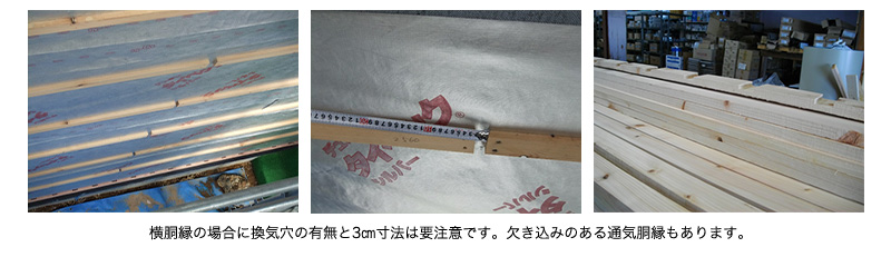 縦張りサイディング材の場合:下地は横胴縁になりますから、下→上には空気が流れませんので要注意です。通気が阻害されることになります。特にサッシ下部の通気が滞留することが多いです。横胴縁の場合には下から上への空気の流れを考えて、欠き込みのある通気胴縁材料を使用するか、2mにつき30㎜以上の隙間を開けることになっています。