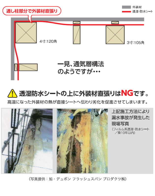 さらに外壁サイディング材を、現在は標準になっている通気工法ではなく、直張り工法で施工するとどうなるのかです。かなりリスクが高くなると言わざるを得ません。