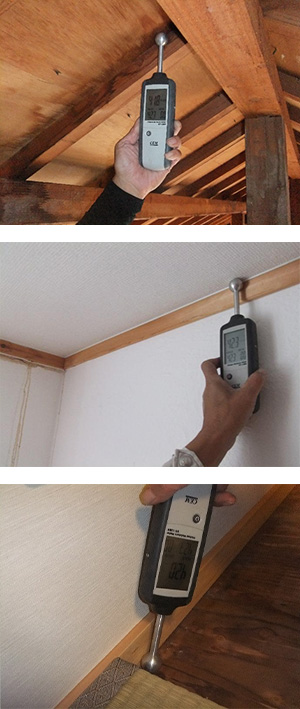 写真上の41.8%、写真中の42.3%、写真下の42.0%という数値は高く、水が浸入していることを示しています。浸入がなければ気乾状態の15%前後です。含水率計の精度も微妙で、必ずしも一定にはなりません。