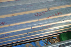某ハウスメーカーの実例です。コスト縮減を目指して、改善を加えたつもりなのでしょう。2次防水である下葺き材をなくし、1次防水の外壁サイディング材だけで対処しようとしました。外壁サイディング材を剥がしてみると…