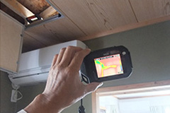 赤外線カメラです。温度差を感知することで、雨漏りの位置がわかるものです。ピンポイントの散水試験(浸入口特定)を実施して、水が浸出すると、温度差があり、写真として明示できます。散水試験を実施しない場合には、そもそも温度差がないわけで、感知…