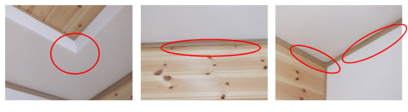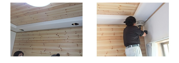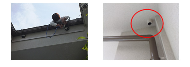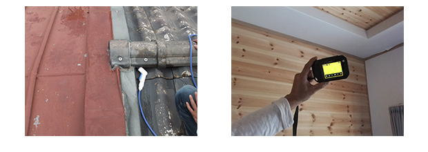 各所に長時間の散水を実施しましたが、〇〇様の室内への浸出を確認できないため、この時点で〇〇様の了解を得て、天井に点検可能な穴を開けました。