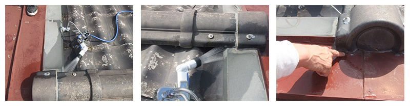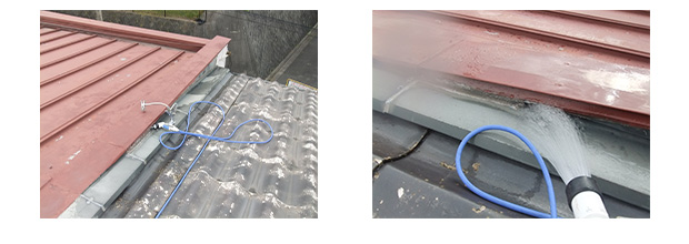 取合い部に順次散水していきます。隣家側から散水しても、隣家側屋根にも水が流れます。棟の反対側(隣家側)からも水が流れます。板金・屋根材は剥がしていませんが、板金内部では貫通しています。室内の浸出は確認できません。