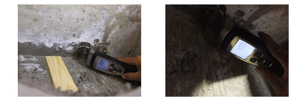 コンクリート部分に水濡れ状の跡が見られます。含水率計でコンクリート部分を計測しました。35.9%、40.0%を示しました。水が浸入していなければ、通常は5~15%を示します。水の浸入の可能性が高いことを示しています。