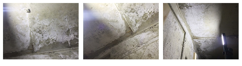 天井点検穴から目視すると、コンクリートスラブ下面に、エフロレッセンス(白華)と呼ばれる白い粉が多く析出しています。エフロレッセンスとは、硬化したコンクリート内部から表面に析出し、結晶化した白い物質のことです。これは雨漏り跡になります。雨漏りという水の供給がなければ、これほど多くのエフロレッセンスは発生しません。スラブ下全面に発生しているわけではなく、部分的発生ですので結露ではなく、雨漏りです。