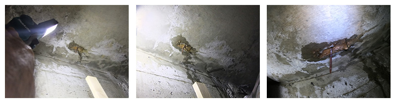 この段階で、水がコンクリートスラブ下端から少しずつ浸出してきました。雨漏り現象が再現できました。
