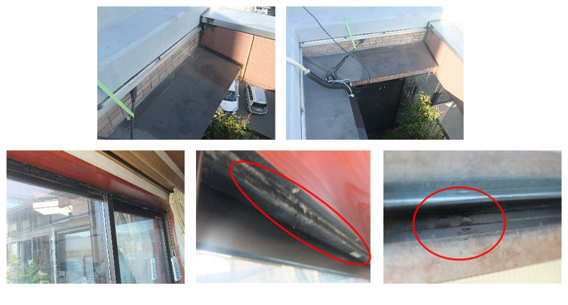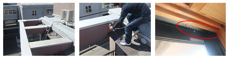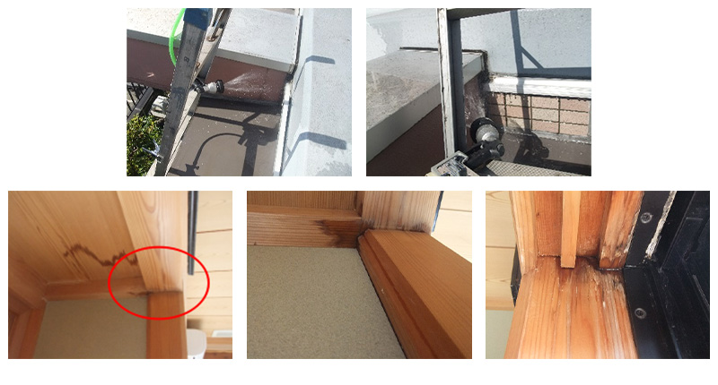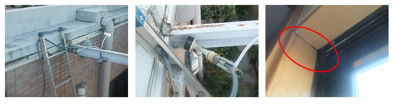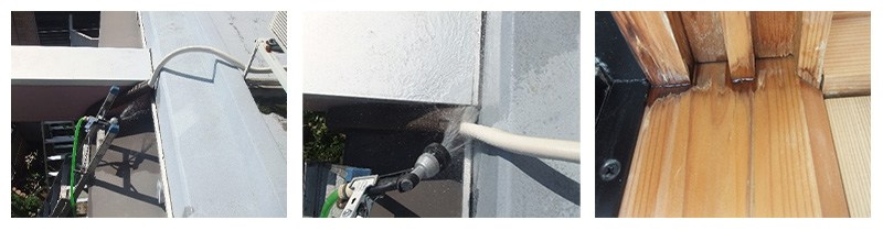 今回の散水試験を実施して、多くの部位から雨水が浸入していることが明確になりました。雨漏りの原因追求は難しく、雨水の浸出口は1箇所であっても、浸入口は複数個所ある場合も多く、今回の散水試験により、雨水浸入の全箇所を適正に見つけられなかった可能性もあります。