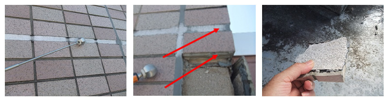 パラペット部分の構造は、下部はALC、上部は鉄筋コンクリート(RC)になっており、構造上の取合い目地とタイルの目地が、45二丁掛タイル1枚分45㎜ズレています。本来は構造上の目地とタイルの目地は合わせるべきものです。台風・地震といった横からの力、温度・乾燥による収縮、車の振動等による建物の動きなどの層間変位に追随できません。テストハンマーでは、ALCの部位は音が浮いています。奥様の許可を得て、タイルを数枚剥がしてみました。比較的簡単に剥がれます。タイル~接着剤でなく、ALC表面で破壊して剥がれます(タイル復旧済)。RC~ALC目地とタイル目地ですが、タイル目地が上にあり、タイル目地から浸入した水がRC~ALC目地に浸入することになります。