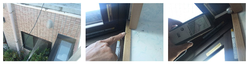外壁タイル表面は濡れずに、タイル内部に水がまわり、サッシ上部シーリング隙間から浸出しています。タイル裏側に水は浸入していることを示しています。サッシ上部には「水抜き穴」が設置されていません。5F納戸の窓も⑭同様に雨水浸入可能性大ですが、荷物が多くあるため、散水試験は行いませんでした。