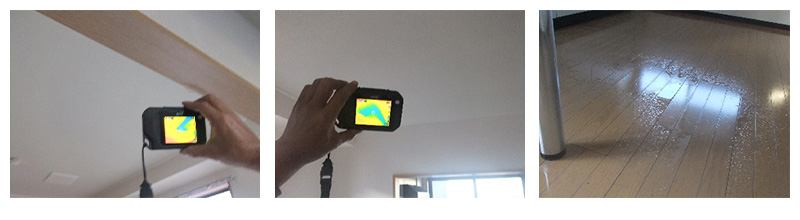 約20分散水で浸出。壁クロスから滴り落ちます。散水翌日の確認では石膏ボードジョイント部の膨れが大きくなっているようです。サーモグラフィーカメラに反応がでています。含水率計では71.7%(通常は15%前後)と高い数値です。