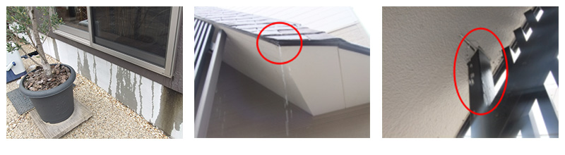 したがって、風がふかない場合には、上から下へ降る雨だけになり、雨漏り現象が現れない場合も多く、大型台風でスピードが遅く直撃する場合などは、一般に①雨量が多く、②風の向きはほぼ全方向、③風の強さは強く、④継続時間はそれなりに長くなり、雨漏りに対しては最悪の条件となります。また、雨水は上から下へ降るだけではなく、風の影響で、横から、場合によっては下から上に向かって舞い上がる場合もあります。