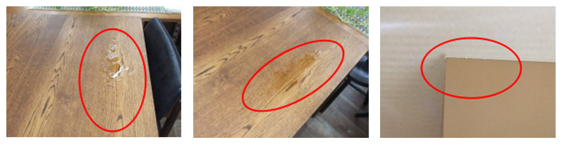2Fの外壁材が室内側から見えます。2次防水である下葺き材が施工されていないとするならば、雨漏りは当然に発生します。2F物入れの階段側壁材に水滴が付きます。室内側に浸出し雨漏りになります。雨漏りによる塗装の劣化が進行しています。この部位は、外気に面する壁になりますが、断熱材が施工されていないために結露発生と断熱不足が懸念されます。散水約30分後、ゲストルームのテーブル天板に雫がつきました。天井から雫が垂れてきました。雨漏りになります。