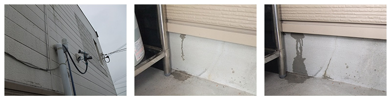 配管貫通部は外壁の防水層に穴を開けることになるため、雨漏りしやすい部位です。約15分散水で1F倉庫の基礎~土台取合い部から水が浸出しました。建物内部に水が浸入しています。