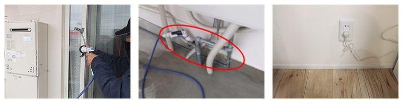 給湯器の配管ですが、ベランダ床の土間コンクリートを4箇所で貫通しています。水は当然にコンクリート内部に浸入します。防水層がなく雨漏りは必然です。