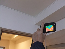 温度差を検知するサーモグラフィー(赤外線)カメラに、青色の反応が出ています。この部位は他の赤・黄色の部位よりも温度が低く、水が浸入していることになります。建物内部に浸入した水が、巾木の下から大量に浸出してきました。徐々に増えていきます。ベランダ直下にあたる浴室・脱衣室・便所・和室・LDKに一気に浸出してきました。