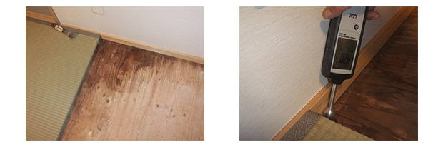 天井・サッシ枠・神棚から垂れてきました。和室の畳をめくると、畳下地合板が濡れています。含水率計で42.0%と高い数値を示し、水が浸入していることを示します。