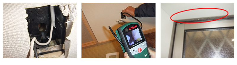 壁内を見るカメラを入れてみると濡れています。和室天井からも浸出します。