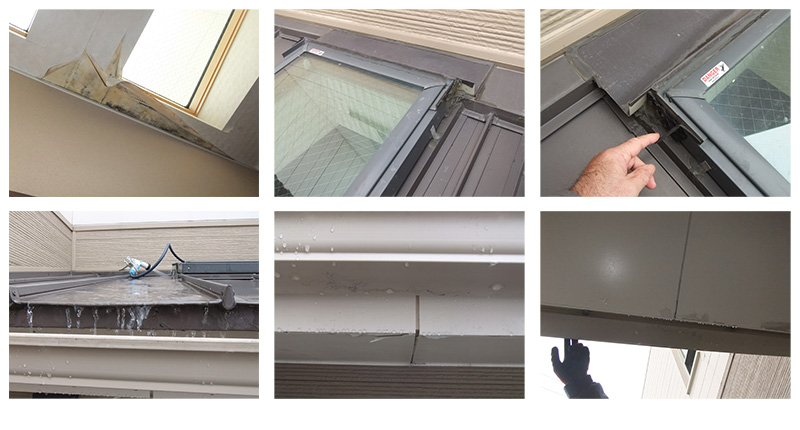 天窓横の向かって左入隅部(南側)に約20分散水すると、玄関天窓とLDK収納から浸出しました。
