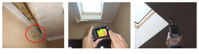 天井クロスがめくれて、黒カビも発生しており、雨漏り跡が明確です。天窓のコーナー部は3面交点になり、雨漏りしやすい部位です。各所に散水しましたがなかなか浸出せず時間がかかりました。