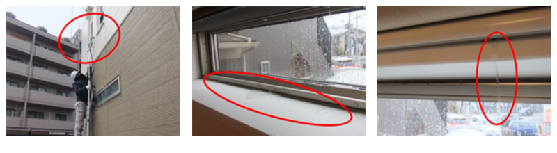 サッシ周りから浸出します。建具枠取り合いから水が垂れてきました。