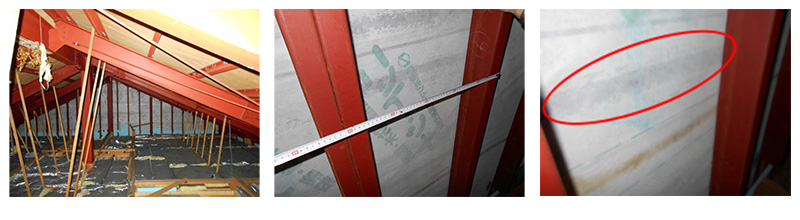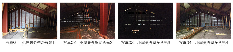 本件建物において、事前に小屋裏の状況写真を見せていただき、異常な光の入り具合がありました。小屋裏空間は、わずかに小屋裏換気口などの通気のための穴から若干の光が漏れる程度で、ほぼ真っ暗状態であることが通常です。これでは外壁サイディング材の相互に隙間があいていることになります。