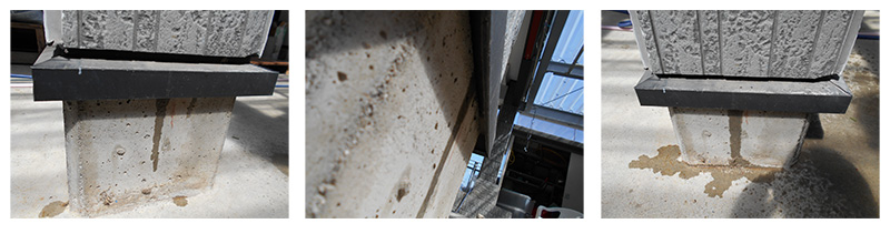 土台水切りの上部から、水が浸出してくると、透湿防水シートの外側を流れた水が、土台水切り立ち上がり部の外部から出るため、外部空間であれば、直接の被害はありません。しかし、下記の写真ように、土台水切りの下部から、水が浸出してくるとなると、話は異なり、異常現象となります。つまり、透湿防水シートの内側に水が浸入していることになり、鉄骨の錆や木部の腐食になり、構造体を傷めることになります。この現象は雨漏りになります。土台水切りの立ち上がり部分の外側に、透湿防水シートが被せてあるため、透湿防水シートに沿って流れる水は、土台水切り上部のサイディング材取り合い目地部分の隙間から浸出するはずです。