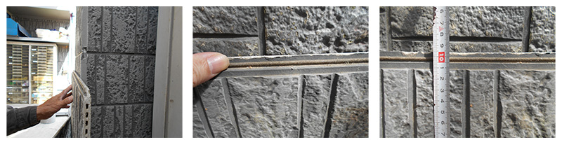 本件建物の外壁サイディング材は横張りであり、上下に継手が生じます。継手には隙間が大きいところでは3mm以上、隙間がほとんどないところもあります。離れたところから、本件建物の外壁を全景として見ると、外壁サイディングの継手の位置が明確にわかります。通常の住宅では、継手が目立たないように張ります。つまり、サイディング材の上下間の隙間が異常に大きいということです。