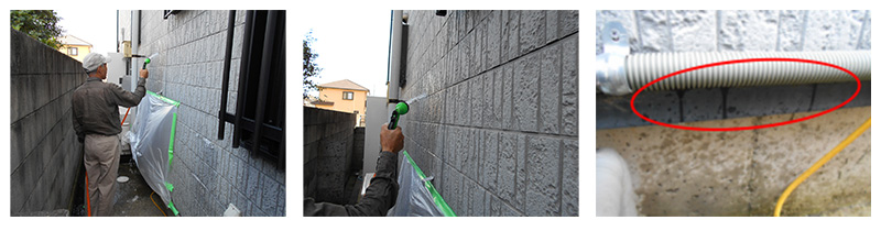 後付けのサンルーム・ガレージ内部に雨漏りがあり、建物本体の室内には雨漏りしないとのことです。雨漏りは、雨量・風の向きと強さ・継続時間の条件により、発生します。現場で確認するために、散水試験を実施しました。今回実施する散水方法は、特別な高圧散水でなく、通常のシャワーヘッドで、約30cm離れて散水しています。