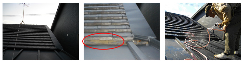 屋根棟瓦と平板瓦の隙間から、雨水が浸入する。浸入量は多くはない。雨水浸入を小屋裏にて、目視確認したが、20分の散水で、雨水が浸入する。