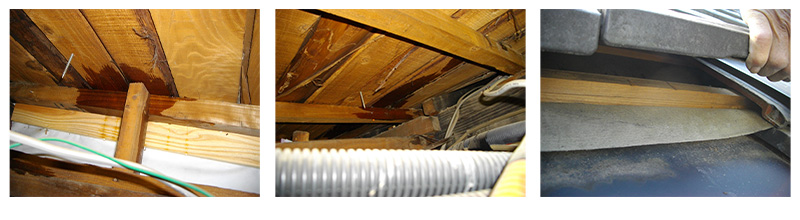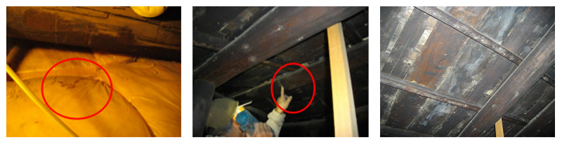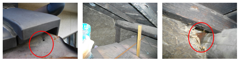 今回の散水試験により、雨水浸入箇所を、北側屋根で4箇所、南側屋根で1箇所発見しました。これらの合計5ヶ所からの雨水浸入は確実です。