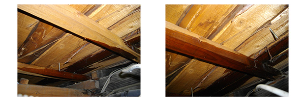 瓦棒板金と平板瓦の施工者が異なり、それぞれ単独の仕事を行ったものの、取合い部の納まりに不備がありました。下葺き材上部の横瓦桟箇所で、水が一度滞留して、徐々に浸入していきます。結果的に瓦棒板金の下葺き材であるアスファルトルーフィングの下側に、雨水が回り込んでいるので、野地板に雨水が浸入しています。瓦棒板金の屋根勾配は緩く、水が排出されにくく、当然に雨漏りが発生する状態です。