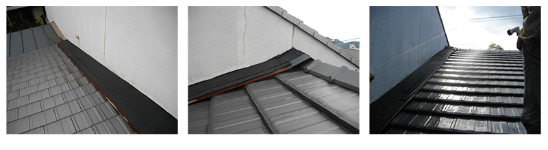 屋根南面の切妻、東側隣家取合い部の板金と平板瓦、防水テープははがれている。取合い部に防水テープ施工。平板瓦には接着跡があり、粘着性を失っている状態