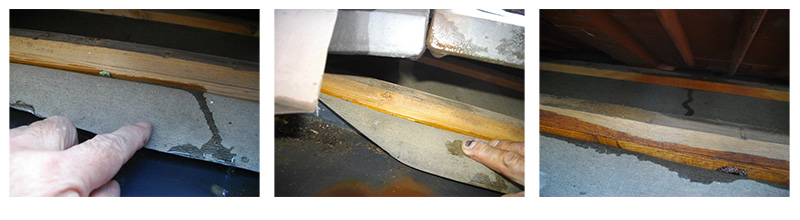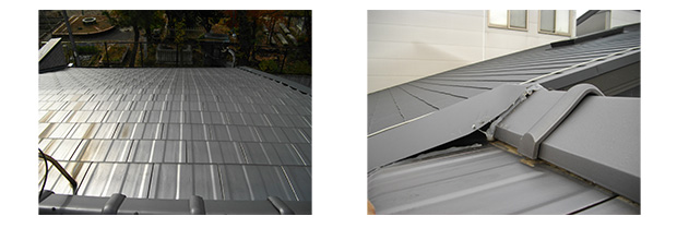 屋根勾配の変わる、瓦棒と平板瓦取合い、右写真は拡大。下葺き材であるアスファルトルーフィングが垂れて見える異常な状態である。瓦棒から平板瓦に向けて、散水開始