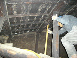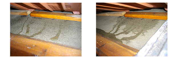 小屋裏の断熱材の上に過去の雨漏り跡、上部の母屋に雨垂れ跡があるが、今回の散水試験では確認できていない。断熱材の上部ということは、リフォーム工事後に、若干の雨漏りしたことが想定される。