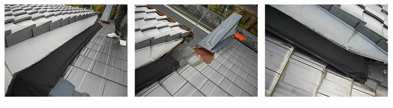 本来は、平板瓦の下葺き材であるアスファルトルーフィングが、瓦棒板金のアスファルトルーフィングの上になるように施工(水下側を先に施工し、水上側を後から上に重ねて施工)し、重なりを100㎜以上確保するべきですが、縁が切れており、結果的に瓦棒板金のアスファルトルーフィングの下側に、雨水が回り込んでいます。当然に雨漏りが発生する状態です。2次防水である下葺き材に、浸入した雨水は、すべてこの部位に集中して雨漏りになります。