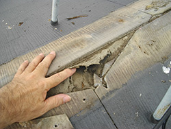 10分以内の短時間の散水で、雨漏り発生。瓦棒板金の下葺き材であるアスファルトルーフィングの立ち上がりが少なく、めくれ上がり、巻いた状態になっている。またアスファルトルーフィングが部分的に破れている。