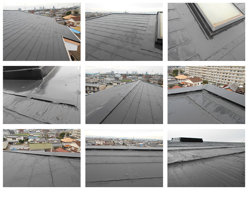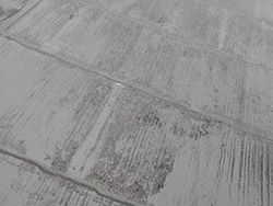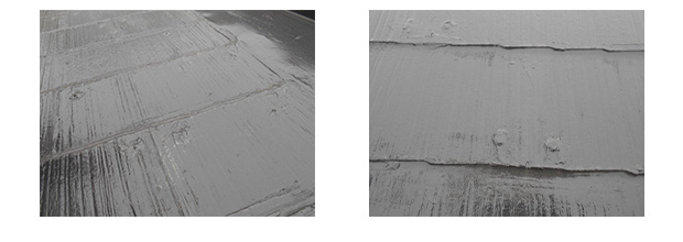 雨漏りと直接の関係はありませんが、屋根材の再塗装工事中において、塗装の乾燥していない間に雨などあった可能性があり、部分的に塗膜が劣化しています。