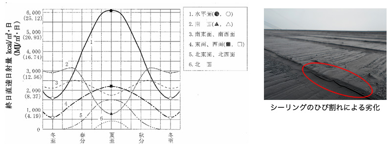 下記のグラフは終日直達日射量を示しています。特に夏場の屋根面は紫外線が多く、劣化が激しくなります。壁面でも南面の劣化は多く、北面の劣化は少ないことになります。シーリング材はメンテナンスとして、通常10年ごとに打ち替えることになっていますが、シーリング材の幅と深さが適正でかつ、接着性を確保するプライマー施工がなされた場合の話です。本件のように、三角形になすられたシーリング材や、プライマー施工が適正でない場合には、耐久性は当然低下することになります。