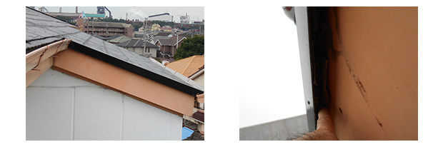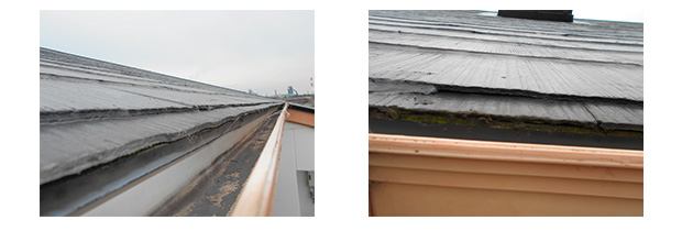 屋根にはシーリングの必要な部位もありますが、これでは屋根材の下部で、雨水が排出できずに滞留していると思われます。雨水が部分的にしろ、滞留するということは、下葺き材であるアスファルトルーフィングの下面まで、雨水が浸入する結果となり、野地板の腐食につながります。建物の耐久性を著しく低下させることになります。