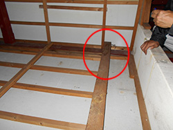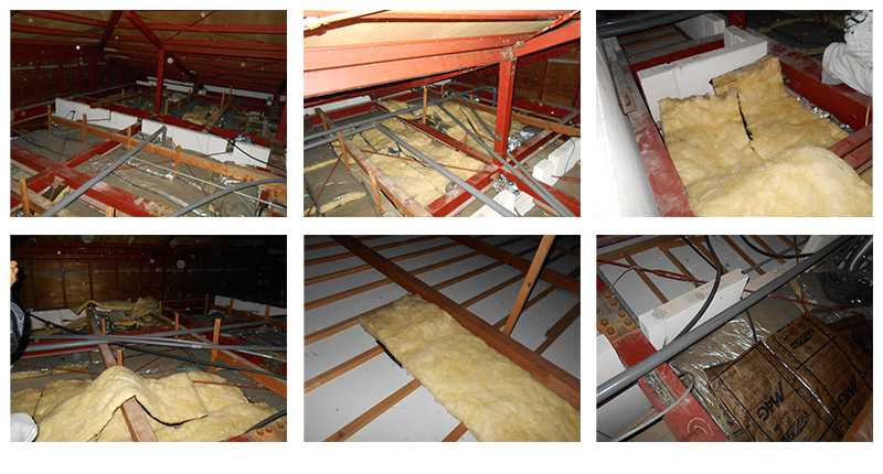 しかし、現状は、遮熱フィルムをわざわざ剥がし、ロックウールが剥き出し状態で、上向きに部分的に設置されているところがあります。これは、雨水が浸入した際に、ロックウールが吸水することにより室内に現れないように実施した可能性があります。遮熱フィルムがあると、雨水が垂れることを考えて剥がしたものと思われます。野地板の雨漏り跡の直下部分にのみ、断熱材が敷かれている所もあります。