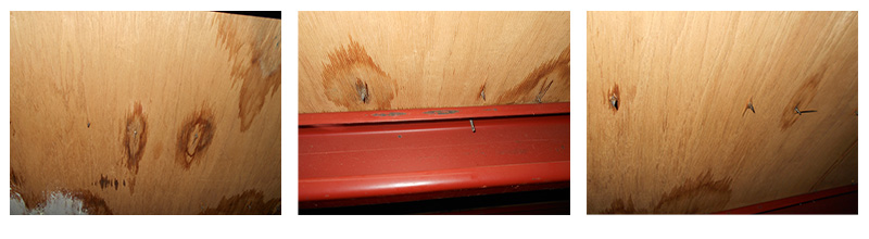 屋根材のカラーベスト固定用スクリュー釘は通常のもので、問題はありません。若干の雨漏り跡もしくは結露跡は見受けられますが、通常の許容範囲内のものです。今回新たにカラーベストの上部から脳天ビス打ち施工したビスについては、余分な穴を下葺き材である防水用のアスファルトルーフィングに穴を開けたことになり問題です。