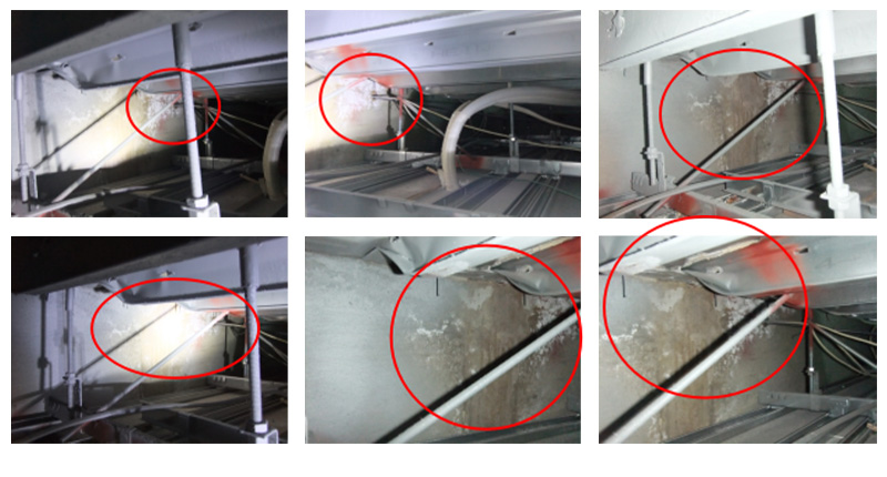 1期工事・2期工事共に既に完了していますが、2期工事で天井点検口が設置されているために、2期工事の範囲の天井裏を直接確認できます。天井裏には漏水の痕跡が明確に確認できます。