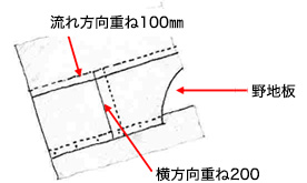 張り方は当然ですが、水が流れやすいように、水の流れる下から先に張ります。そして順次、水上に向かって張ります。水の流れに逆らうことはできません。アスファルトルーフィングの重なりは、流れ方向100㎜、横方向200㎜が標準です。