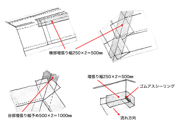 棟・隅棟・谷といった取り合い部は雨漏りの可能性の高い部位となりますので、増張り補強が必要となります。