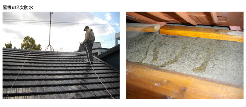多くの雨水は瓦の上を流れて排出されますが、瓦自体には1面としての防水材の役目はなく、瓦単体を重ねて置いた状態です。瓦相互の隙間から、雨水は2次防水である下葺き材の上まで浸入することになります。そして2次防水である下葺き材の上を流れる水は、軒先から排水できれば雨漏りではありません。2次防水である下葺き材に不具合があると、雨水は下葺き材の下に浸入し、雨漏り現象となります。2次防水の重要性を示しています。