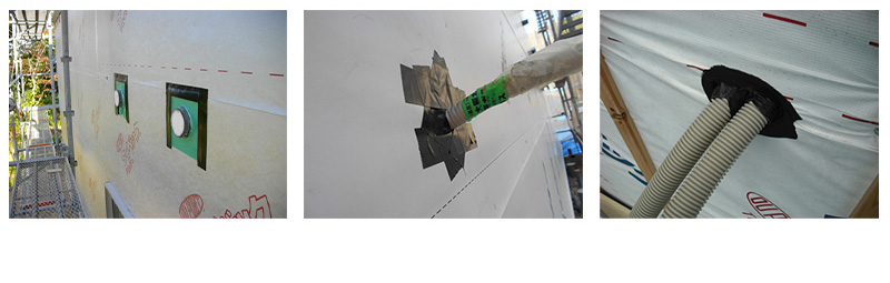 配管周りも穴を開ける部位になりますから、施工に配慮が必要となります。樹脂製役物の使用か、伸縮性のある防水テープを使用しなければなりません。現場では、これらの材料の準備がなく、伸縮性のない通常の防水テープを短くカットしながら施工している場合も多いです。