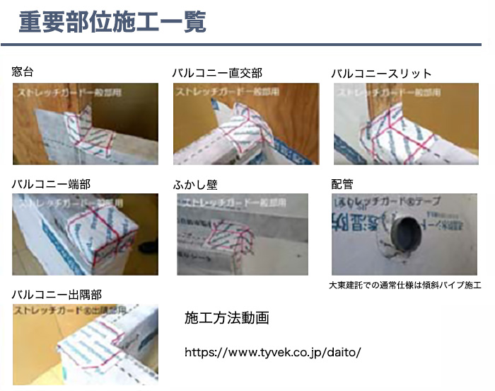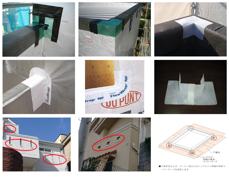 住宅部位においては例えば、屋根では、下屋根・棟頂部と上階外壁下地との交点、入隅部、出隅部などです。開口部(サッシ)まわりでは、窓台上端部と柱または間柱見込み面と外壁下地面の交点です。バルコニー手すり壁においては、 壁当たり部(外壁と同側面および外壁と直交部)です。