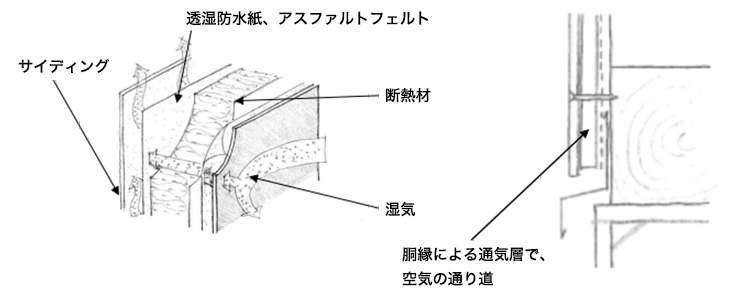 「外壁通気工法」という施工法があります。雨漏れと通気工法がどういう関連があるのかを説明します。外壁通気工法とは、外壁サイディング工事、または左官工事でも可能ですが、外壁材と建物本体の構造体の間に通気層を設けるものです。その通気層の上下を外気に解放するのです。通気層すなわち隙間を設ける方法は金具や胴縁と呼ばれるパッキン材で外壁材を浮かせて取り付けます。直張りしないのです。通気層の更に室内側にはアスファルトフェルトや透湿防水シートなどの防水紙を貼ります。この防水紙はサイディング材料の1次防水と比較して、2次防水の役目を果たします。