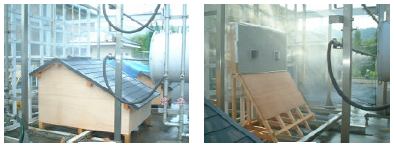 非常に厳しい条件設定で、雨漏りの実験を行ったことがあります。換気のための部材を取り付けて、大量の水と強風をかけました。厳しい条件であっても、雨漏りしない部材を採用しようという発想です。発想は悪くはなかったのですが、設定条件が厳し過ぎ、全ての換気部材から雨漏りが発生しました。