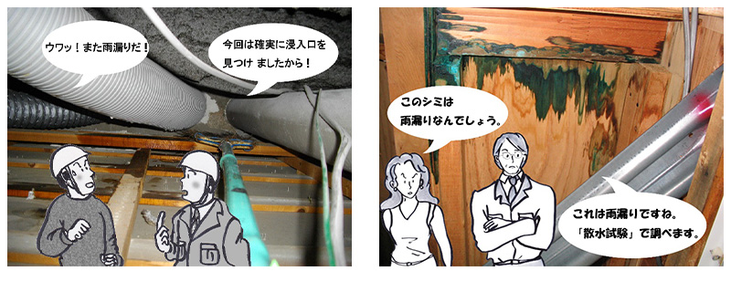 雨水の浸入口を完全に見つけることは難しく、雨漏りは、雨水の浸入口を的確に見つけることが生命線になります。